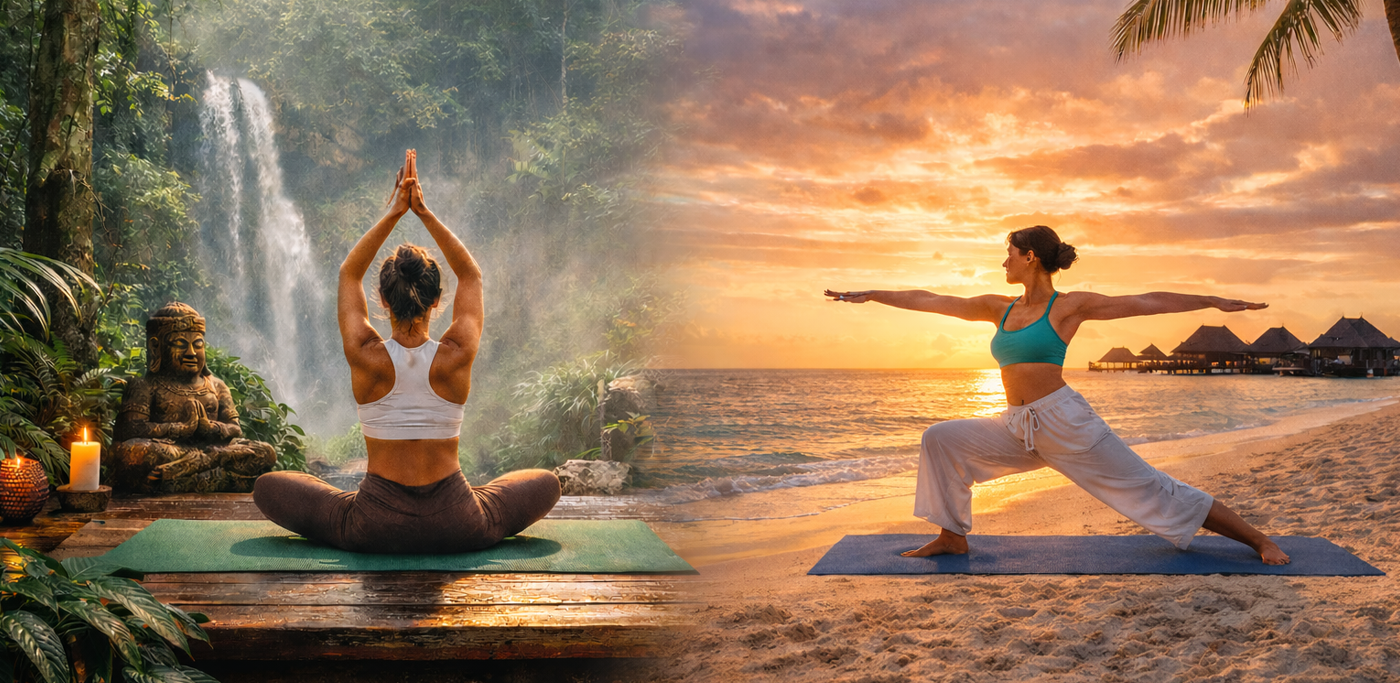 Beach yoga offers a different kind of healing. The steady sound of waves, salty sea air, and open horizons naturally calm the nervous system. Sunrise and sunset practices on the beach are highlights of many retreats.