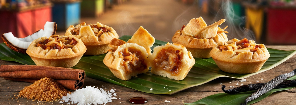 Coconut tarts are the quintessential Belizean sweet — and virtually every bakery, market vendor, and Belizean grandmother has their own version. At their best, these are small, crisp pastry shells filled with a richly spiced, sweetened coconut filling made from freshly grated coconut, brown sugar, cinnamon, vanilla, and sometimes a splash of rum. The pastry shatters gently as you bite through, giving way to that fragrant, sweet coconut interior.